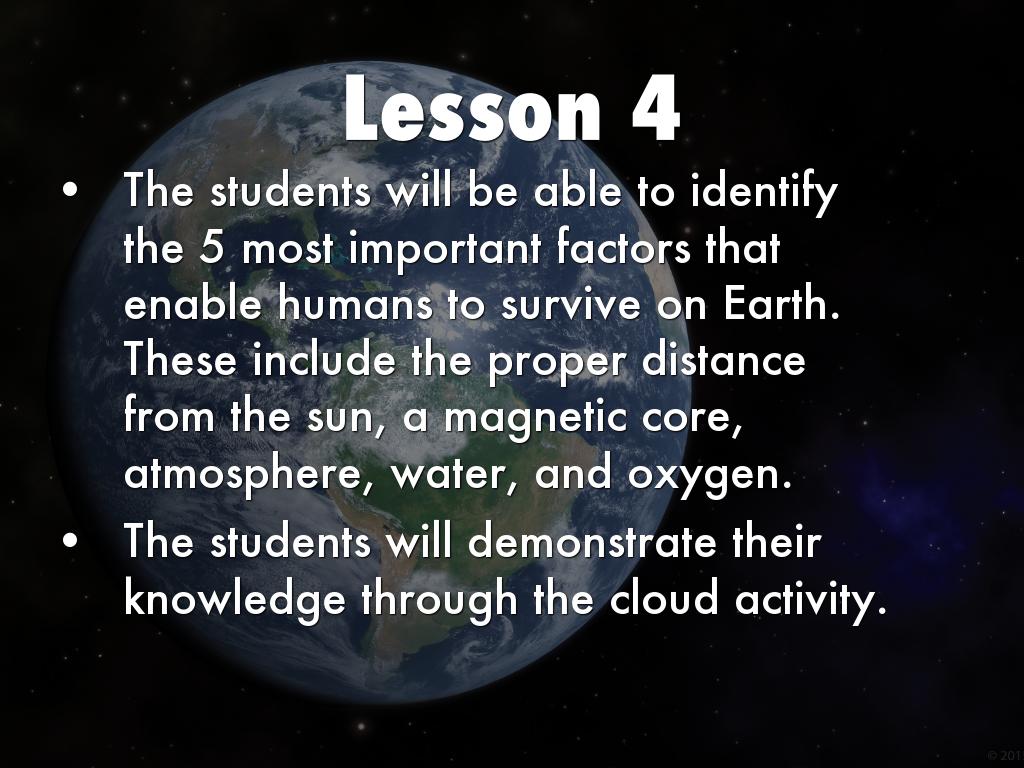 The students will be able to identify the 5 most important factors that enable humans to survive on Earth. These include the proper distance from the sun, a magnetic core, atmosphere, water, and oxygen.
