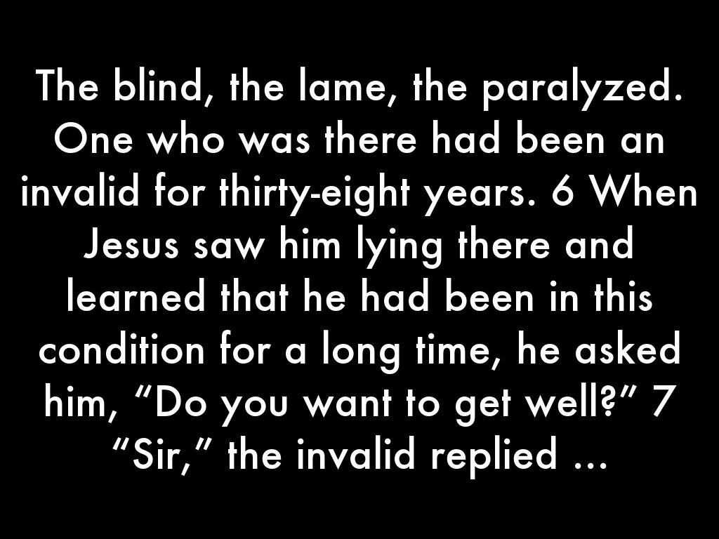 The blind, the lame, the paralyzed. One who was there had been an invalid for thirty-eight years. 6 When Jesus saw him lying there and learned that he had been in this condition for a long time, he asked him, “Do you want to get well?” 7 “Sir,” the invalid replied ...