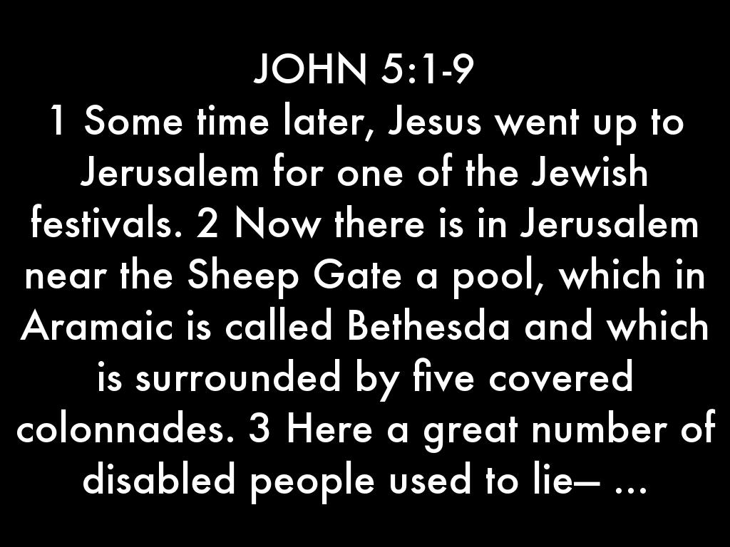 1 Some time later, Jesus went up to Jerusalem for one of the Jewish festivals. 2 Now there is in Jerusalem near the Sheep Gate a pool, which in Aramaic is called Bethesda and which is surrounded by five covered colonnades. 3 Here a great number of disabled people used to lie— ...
