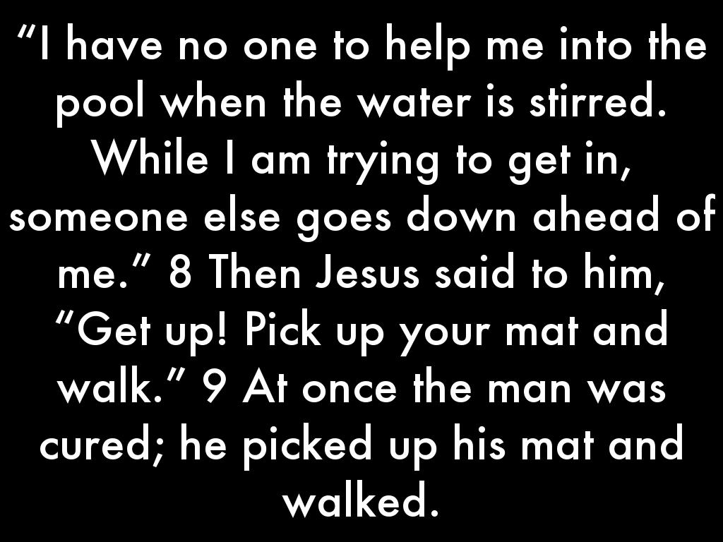 “I have no one to help me into the pool when the water is stirred. While I am trying to get in, someone else goes down ahead of me.” 8 Then Jesus said to him, “Get up! Pick up your mat and walk.” 9 At once the man was cured; he picked up his mat and walked.