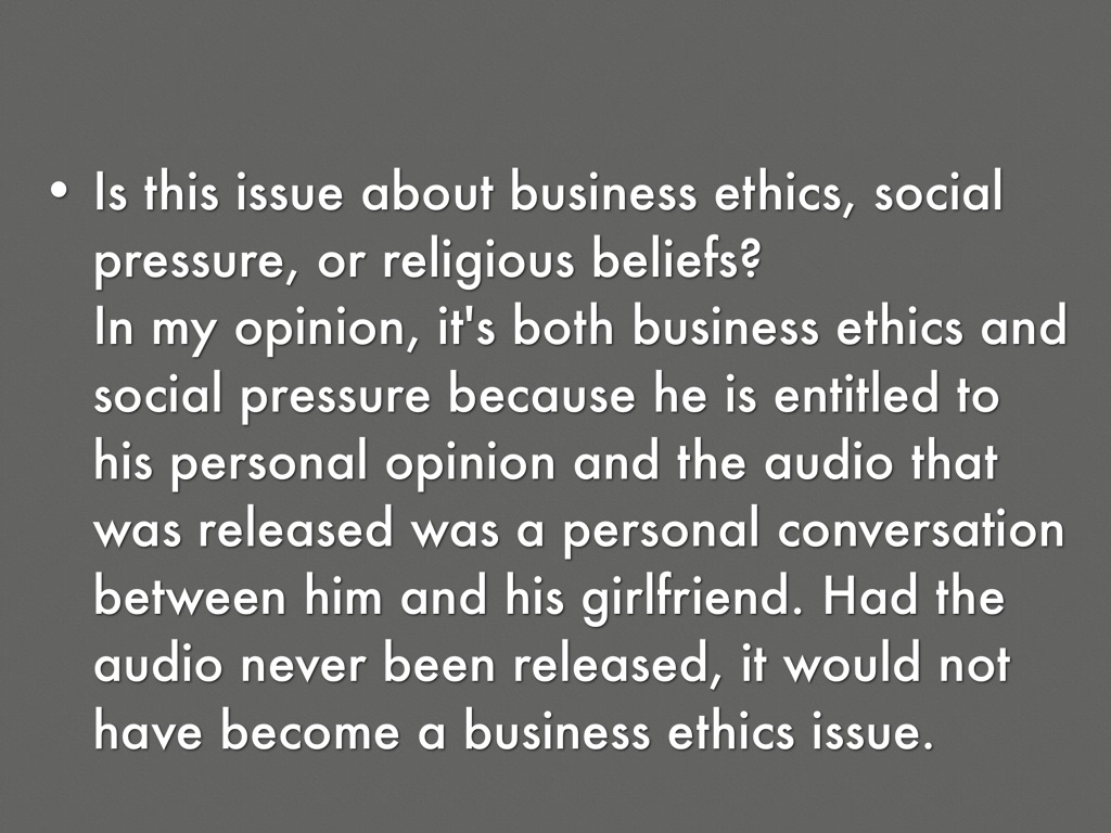 In my opinion, it's both business ethics and social pressure because he is entitled to his personal opinion and the audio that was released was a personal conversation between him and his girlfriend. Had the audio never been released, it would not have become a business ethics issue.