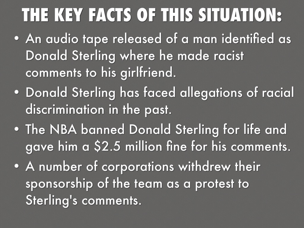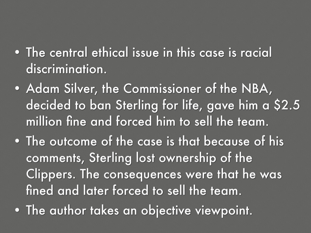 The outcome of the case is that because of his comments, Sterling lost ownership of the Clippers. The consequences were that he was fined and later forced to sell the team.