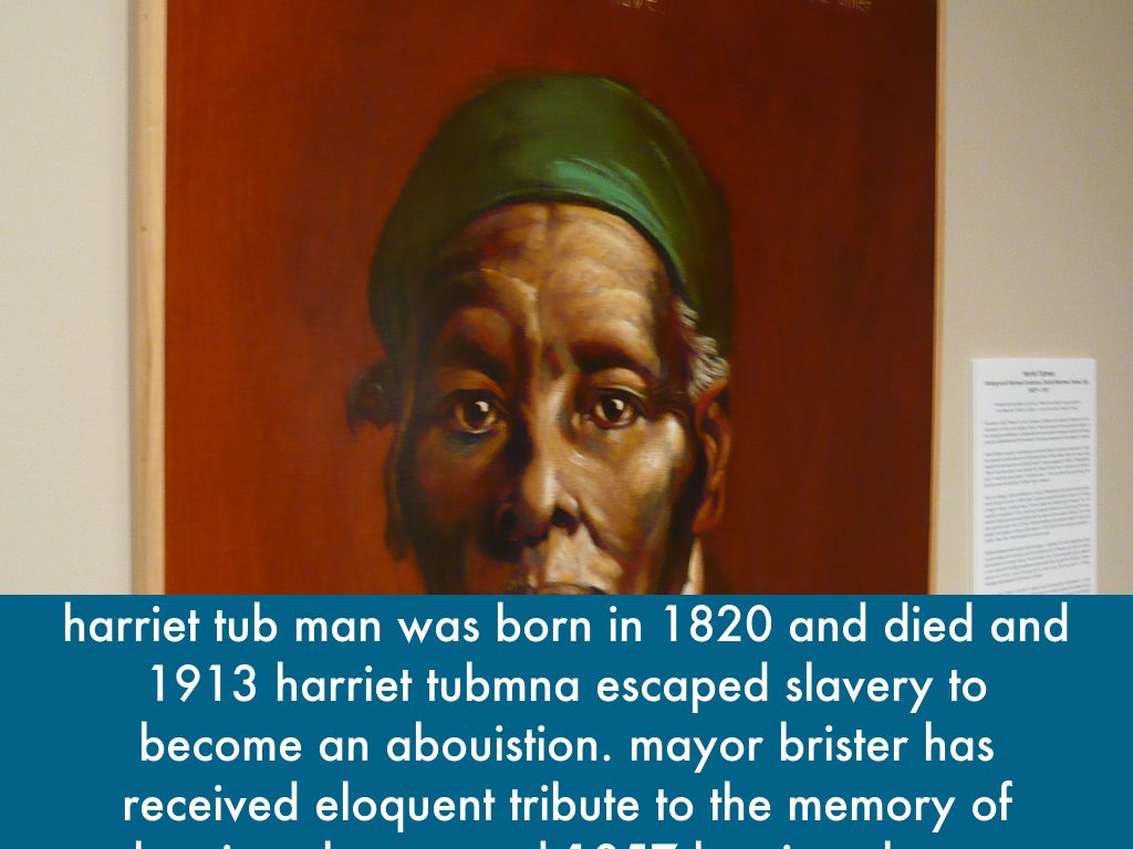 harriet tub man was born in 1820 and died and 1913 harriet tubmna escaped slavery to become an abouistion. mayor brister has received eloquent tribute to the memory of harriet tubman. and 1857 harriet tubman relocated her parents from st.catharines in 1863 harriet tubman. led o group of african american union soldiers