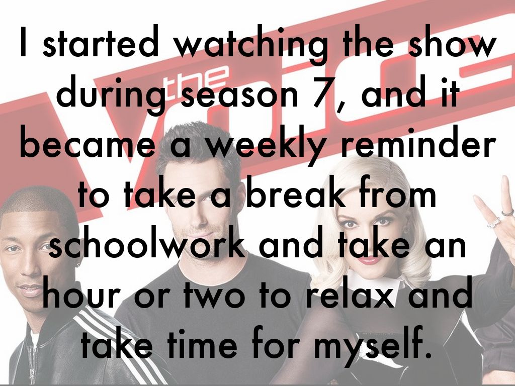 I started watching the show during season 7, and it became a weekly reminder to take a break from schoolwork and take an hour or two to relax and take time for myself.