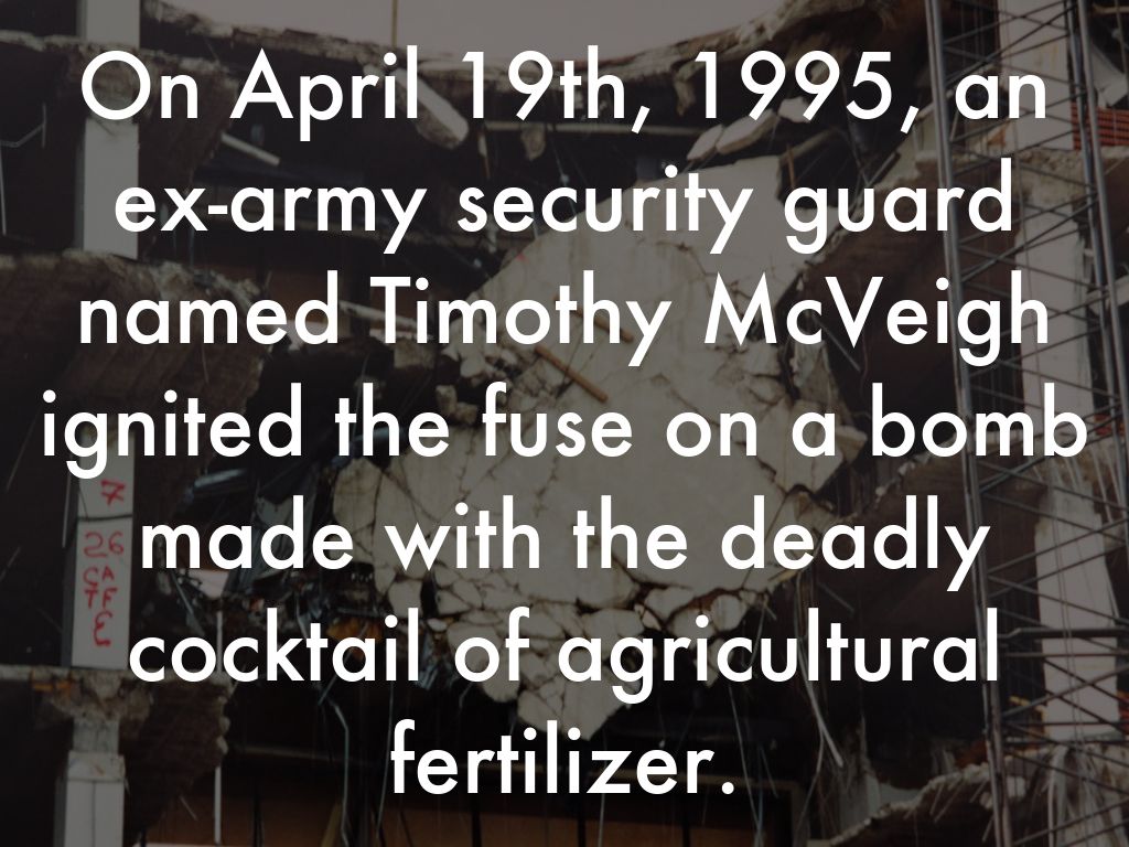 On April 19th, 1995, an ex-army security guard named Timothy McVeigh ignited the fuse on a bomb made with the deadly cocktail of agricultural fertilizer.