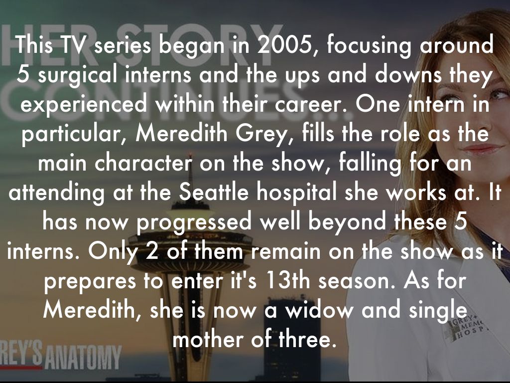 This TV series began in 2005, focusing around 5 surgical interns and the ups and downs they experienced within their career. One intern in particular, Meredith Grey, fills the role as the main character on the show, falling for an attending at the Seattle hospital she works at. It has now progressed well beyond these 5 interns. Only 2 of them remain on the show as it prepares to enter it's 13th season. As for Meredith, she is now a widow and single mother of three.