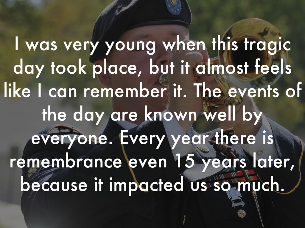I was very young when this tragic day took place, but it almost feels like I can remember it. The events of the day are known well by everyone. Every year there is remembrance even 15 years later, because it impacted us so much.