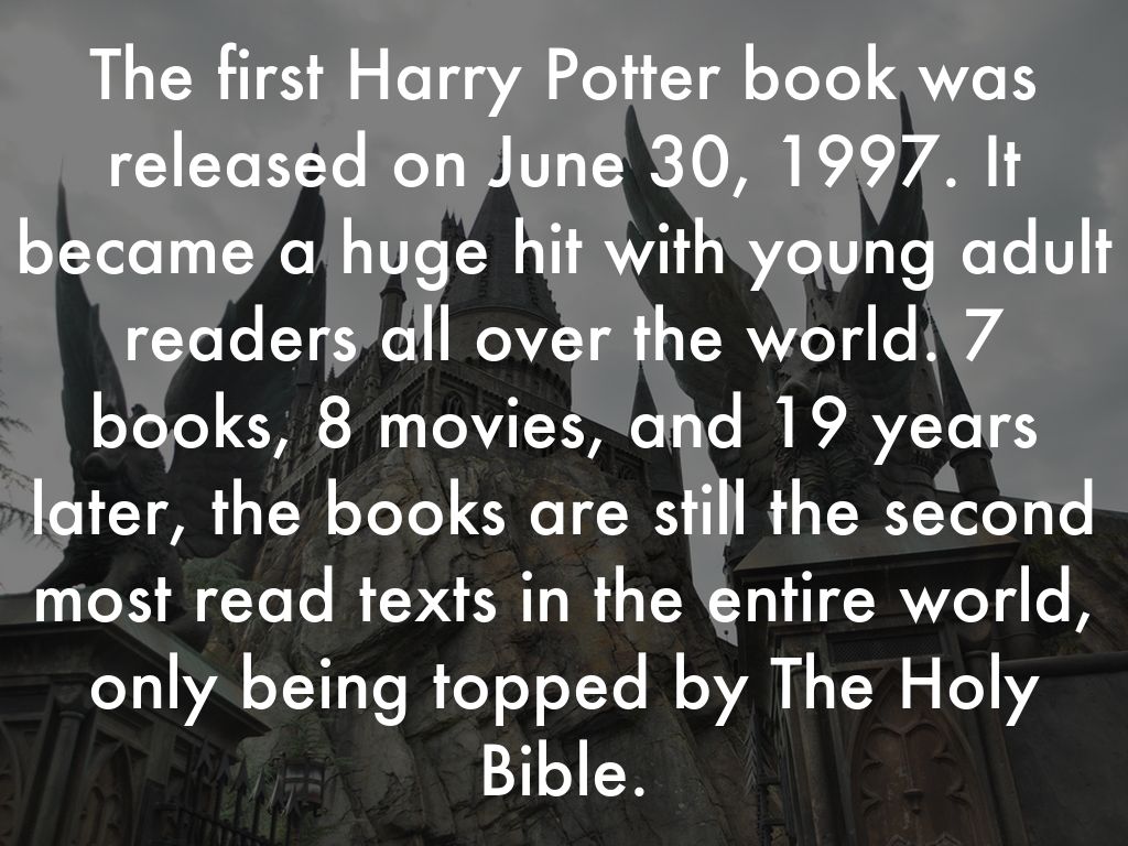 The first Harry Potter book was released on June 30, 1997. It became a huge hit with young adult readers all over the world. 7 books, 8 movies, and 19 years later, the books are still the second most read texts in the entire world, only being topped by The Holy Bible.