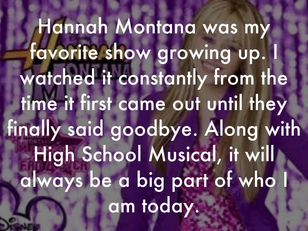 Hannah Montana was my favorite show growing up. I watched it constantly from the time it first came out until they finally said goodbye. Along with High School Musical, it will always be a big part of who I am today.