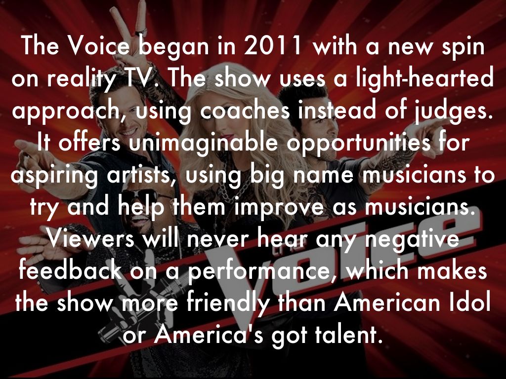 The Voice began in 2011 with a new spin on reality TV. The show uses a light-hearted approach, using coaches instead of judges. It offers unimaginable opportunities for aspiring artists, using big name musicians to try and help them improve as musicians. Viewers will never hear any negative feedback on a performance, which makes the show more friendly than American Idol or America's got talent.