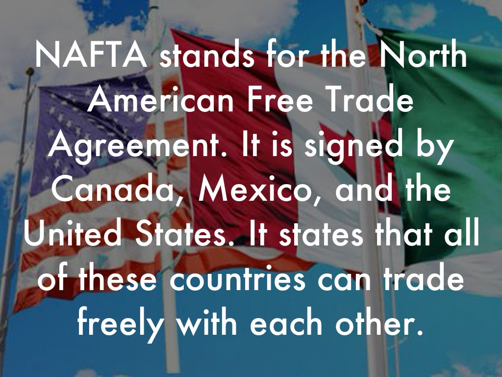 NAFTA stands for the North American Free Trade Agreement. It is signed by Canada, Mexico, and the United States. It states that all of these countries can trade freely with each other.