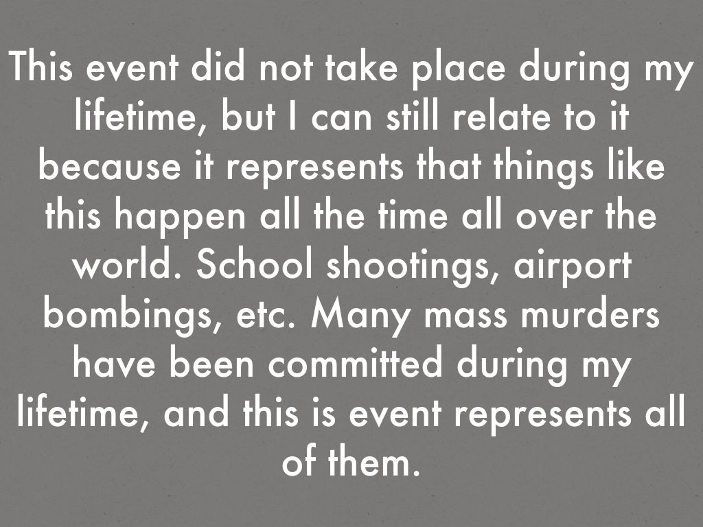 This event did not take place during my lifetime, but I can still relate to it because it represents that things like this happen all the time all over the world. School shootings, airport bombings, etc. Many mass murders have been committed during my lifetime, and this is event represents all of them.