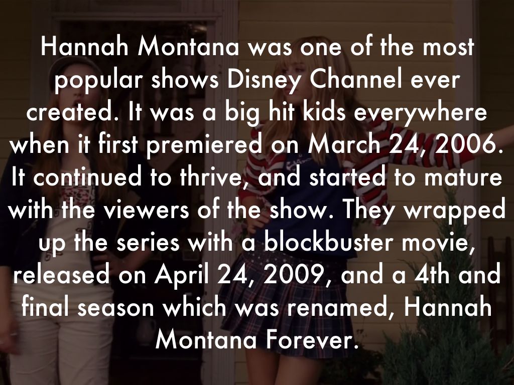 Hannah Montana was one of the most popular shows Disney Channel ever created. It was a big hit kids everywhere when it first premiered on March 24, 2006. It continued to thrive, and started to mature with the viewers of the show. They wrapped up the series with a blockbuster movie, released on April 24, 2009, and a 4th and final season which was renamed, Hannah Montana Forever.
