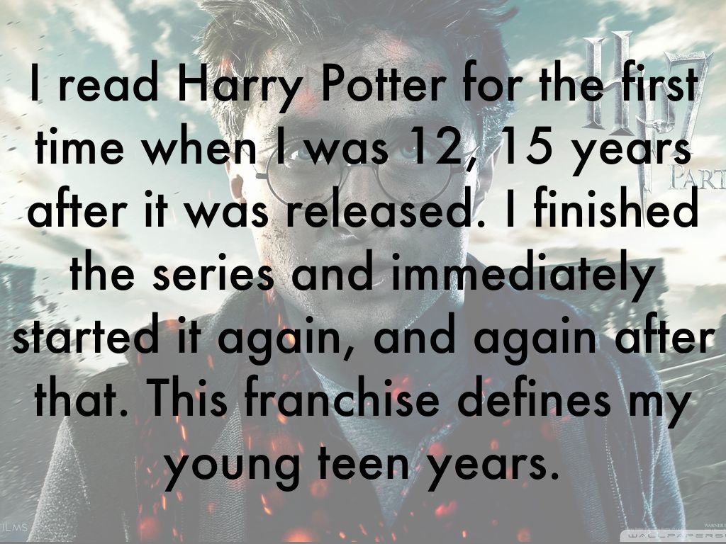I read Harry Potter for the first time when I was 12, 15 years after it was released. I finished the series and immediately started it again, and again after that. This franchise defines my young teen years.