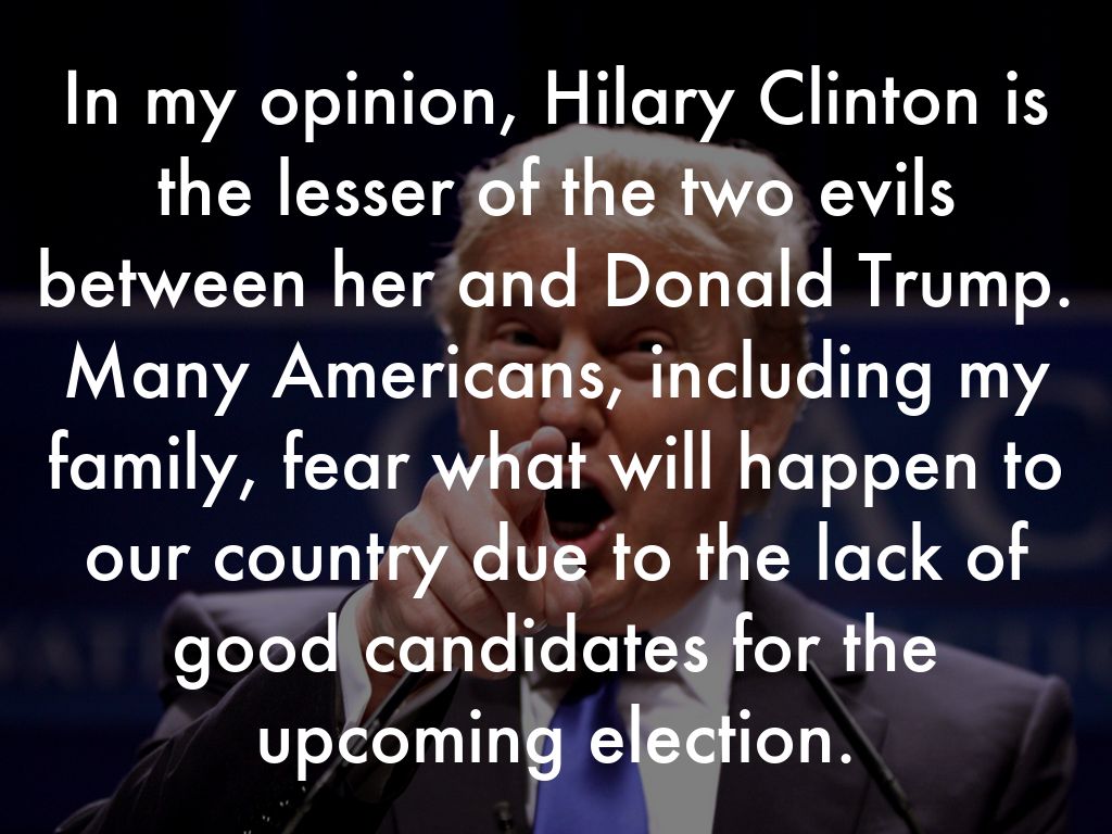 In my opinion, Hilary Clinton is the lesser of the two evils between her and Donald Trump. Many Americans, including my family, fear what will happen to our country due to the lack of good candidates for the upcoming election.
