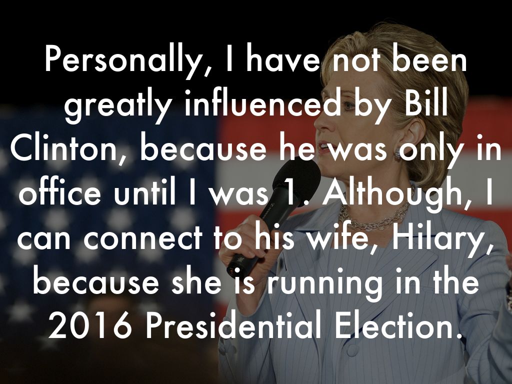 Personally, I have not been greatly influenced by Bill Clinton, because he was only in office until I was 1. Although, I can connect to his wife, Hilary, because she is running in the 2016 Presidential Election.