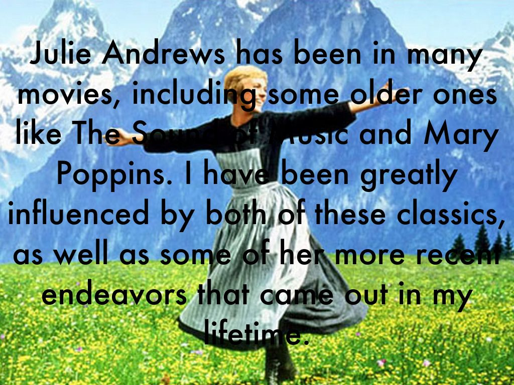 Julie Andrews has been in many movies, including some older ones like The Sound of Music and Mary Poppins. I have been greatly influenced by both of these classics, as well as some of her more recent endeavors that came out in my lifetime.