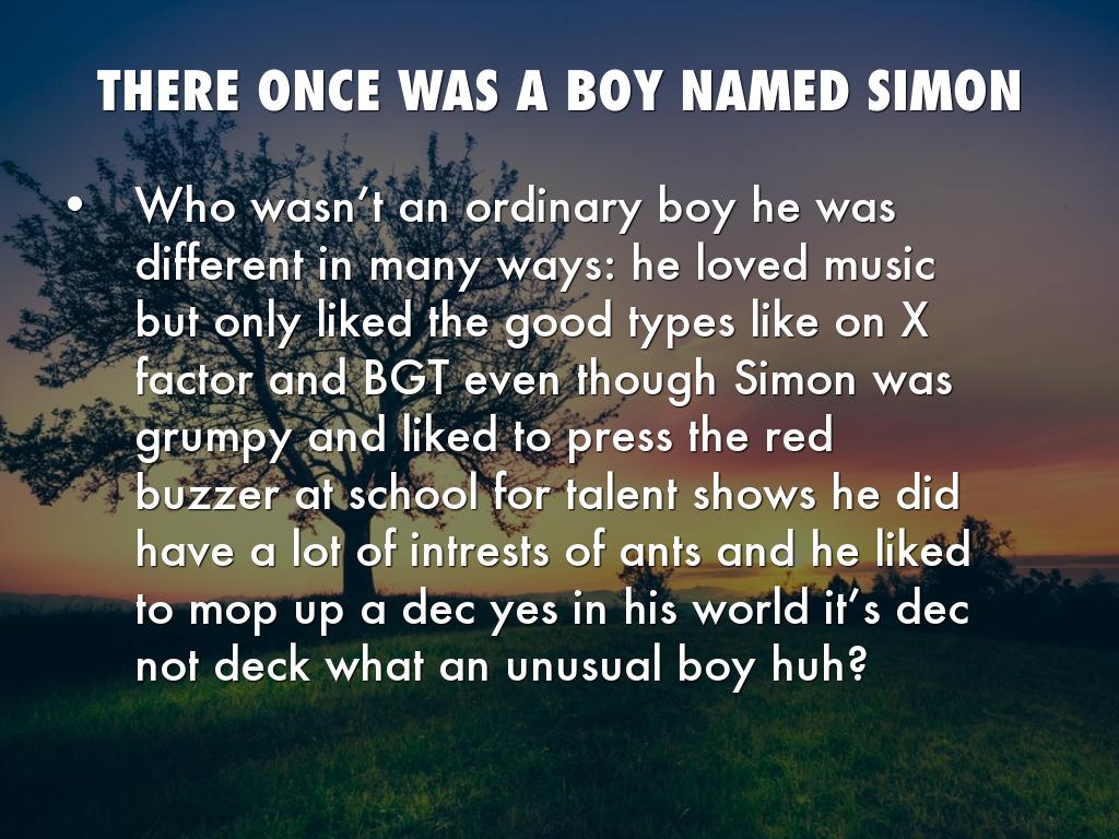 Who wasn’t an ordinary boy he was different in many ways: he loved music but only liked the good types like on X factor and BGT even though Simon was grumpy and liked to press the red buzzer at school for talent shows he did have a lot of intrests of ants and he liked to mop up a dec yes in his world it’s dec not deck what an unusual boy huh?