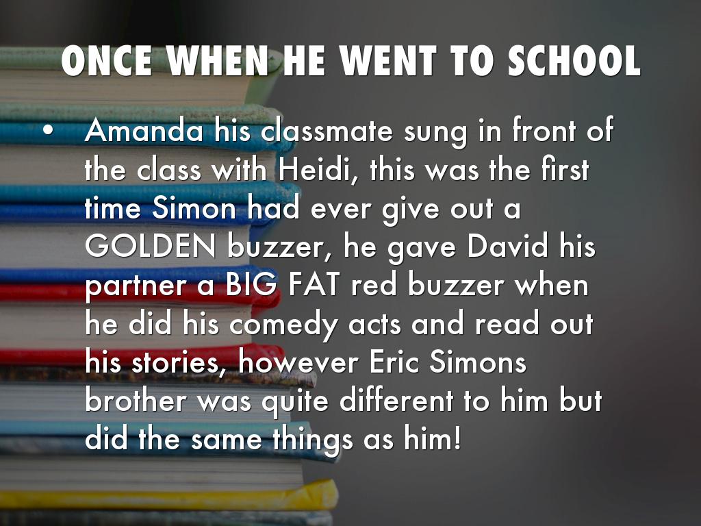Amanda his classmate sung in front of the class with Heidi, this was the first time Simon had ever give out a GOLDEN buzzer, he gave David his partner a BIG FAT red buzzer when he did his comedy acts and read out his stories, however Eric Simons brother was quite different to him but did the same things as him!