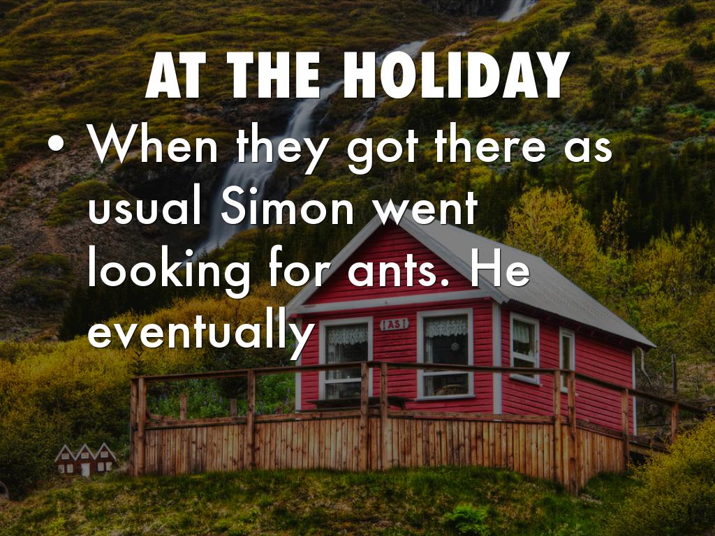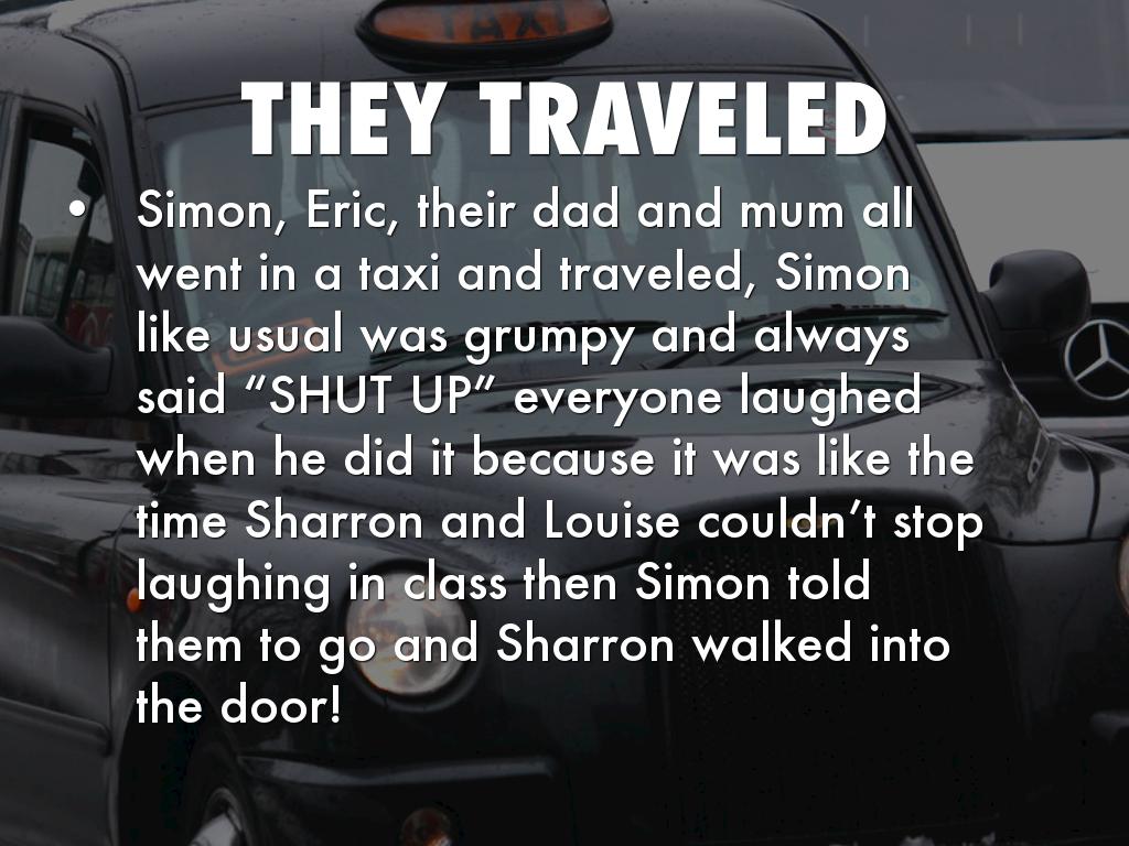 Simon, Eric, their dad and mum all went in a taxi and traveled, Simon like usual was grumpy and always said “SHUT UP” everyone laughed when he did it because it was like the time Sharron and Louise couldn’t stop laughing in class then Simon told them to go and Sharron walked into the door!
