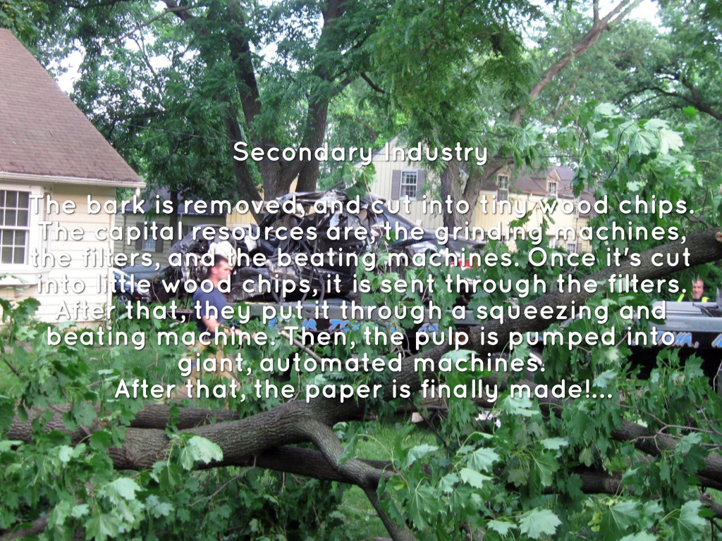 The bark is removed, and cut into tiny wood chips. The capital resources are, the grinding machines, the filters, and the beating machines. Once it's cut into little wood chips, it is sent through the filters. After that, they put it through a squeezing and beating machine. Then, the pulp is pumped into giant, automated machines. After that, the paper is finally made!