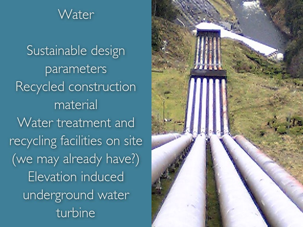 Sustainable design parameters Recycled construction material Water treatment and recycling facilities on site (we may already have?) Elevation induced underground water turbine