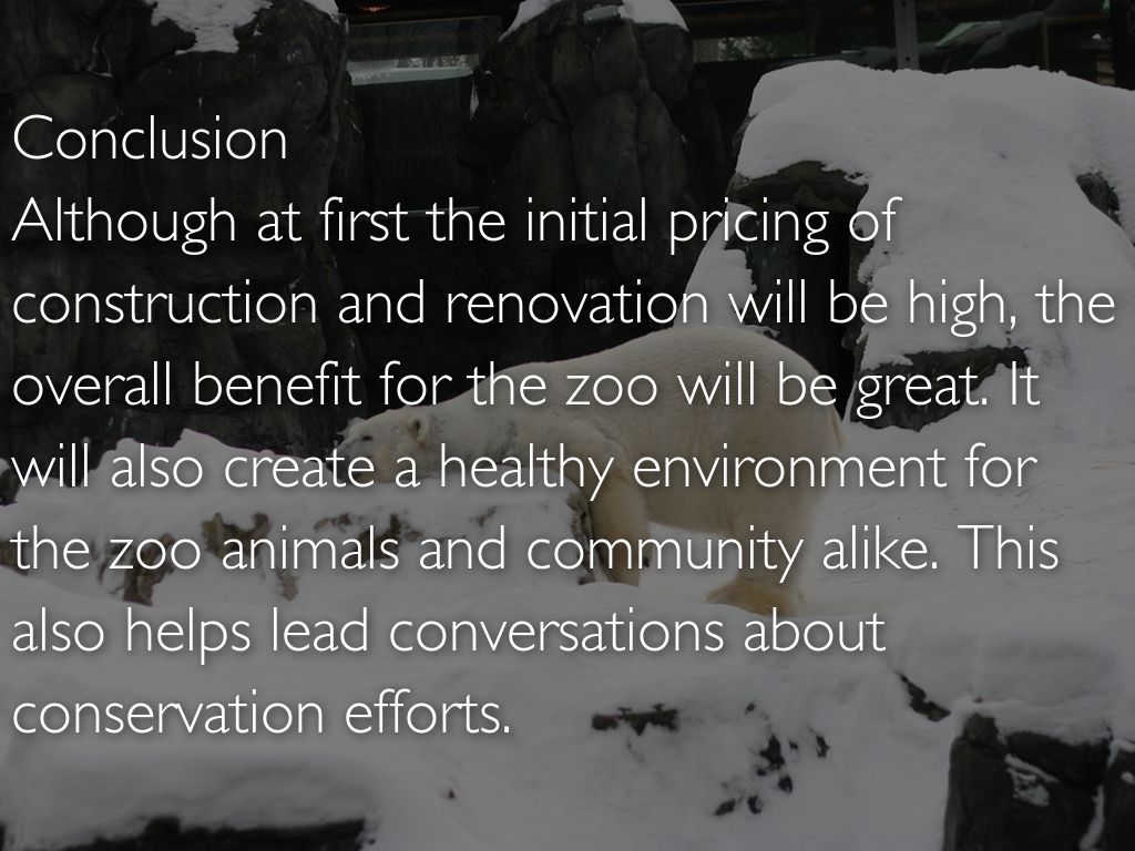 Conclusion Although at first the initial pricing of construction and renovation will be high, the overall benefit for the zoo will be great. It will also create a healthy environment for the zoo animals and community alike. This also helps lead conversations about conservation efforts.