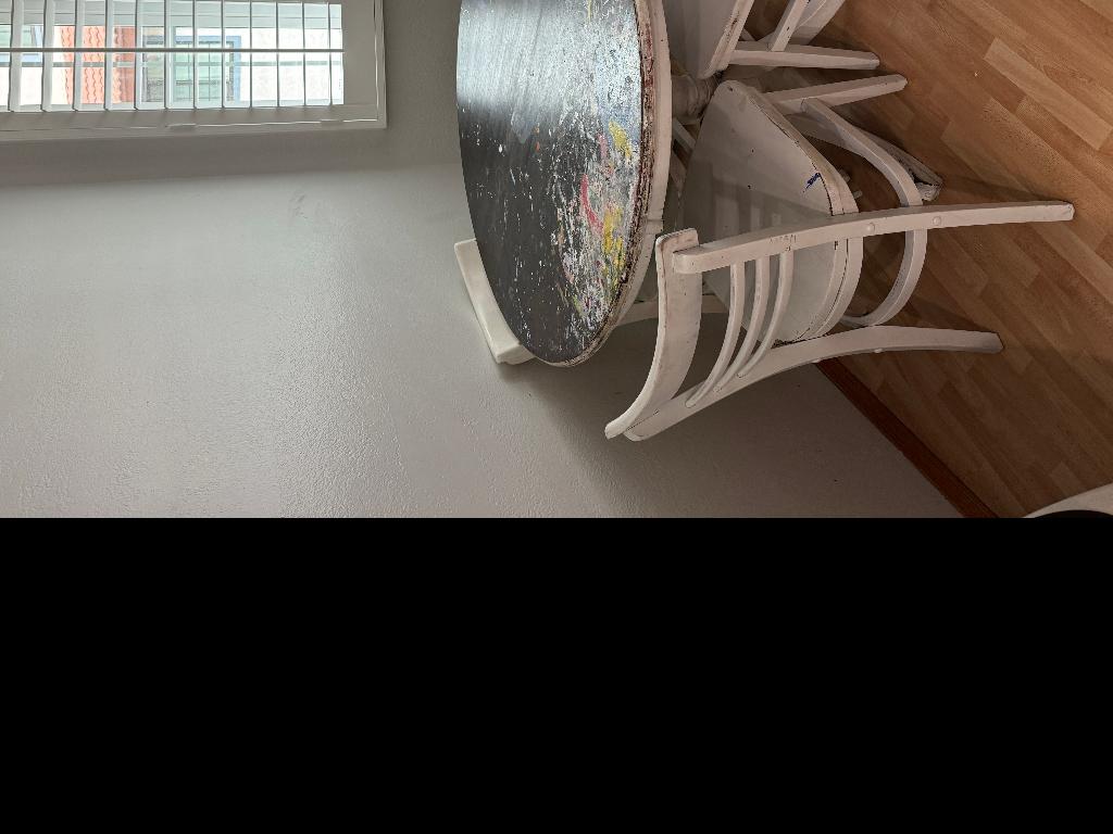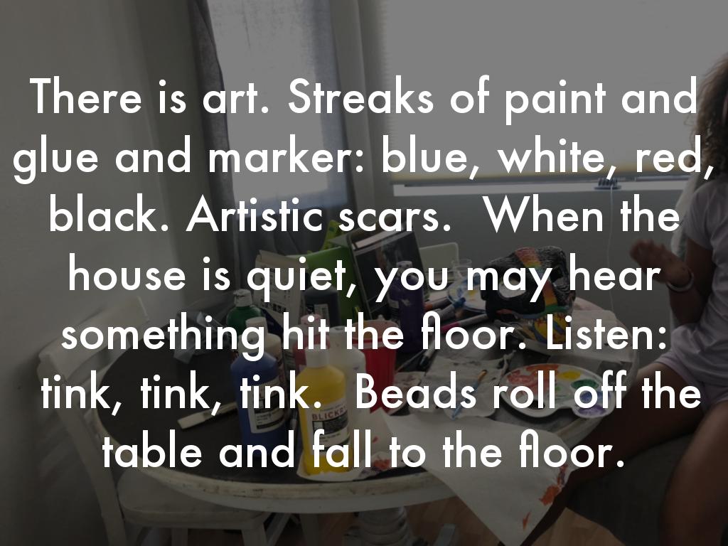 There is art. Streaks of paint and glue and marker: blue, white, red, black. Artistic scars. When the house is quiet, you may hear something hit the floor. Listen: tink, tink, tink. Beads roll off the table and fall to the floor.