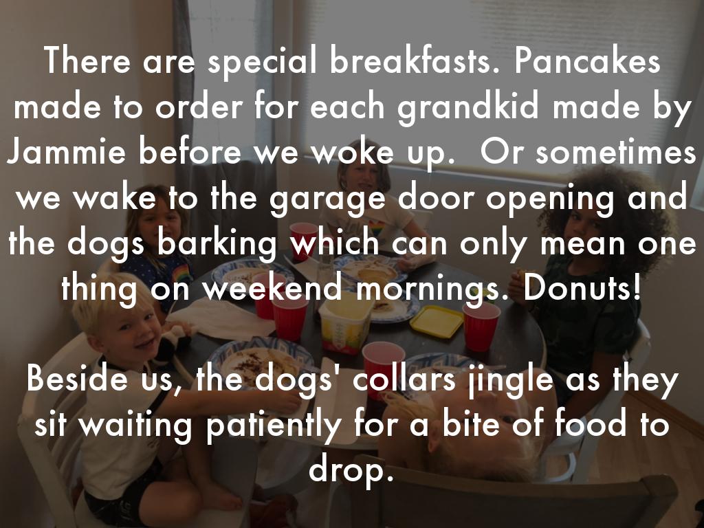 There are special breakfasts. Pancakes made to order for each grandkid made by Jammie before we woke up. Or sometimes we wake to the garage door opening and the dogs barking which can only mean one thing on weekend mornings. Donuts!