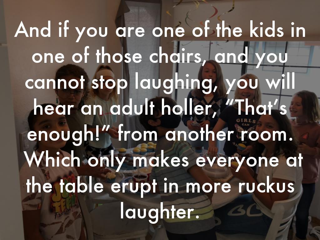 And if you are one of the kids in one of those chairs, and you cannot stop laughing, you will hear an adult holler, “That’s enough!” from another room. Which only makes everyone at the table erupt in more ruckus laughter.