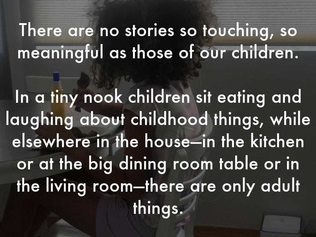 In a tiny nook children sit eating and laughing about childhood things, while elsewhere in the house—in the kitchen or at the big dining room table or in the living room—there are only adult things.