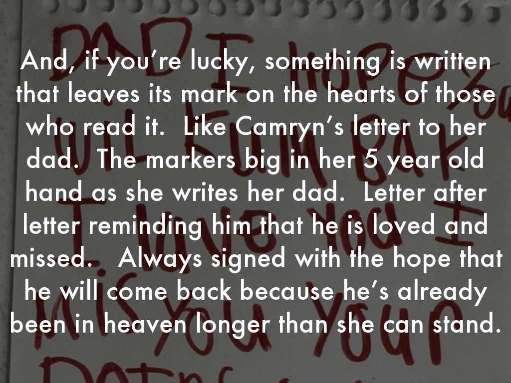 And, if you’re lucky, something is written that leaves its mark on the hearts of those who read it. Like Camryn’s letter to her dad. The markers big in her 5 year old hand as she writes her dad. Letter after letter reminding him that he is loved and missed. Always signed with the hope that he will come back because he’s already been in heaven longer than she can stand.