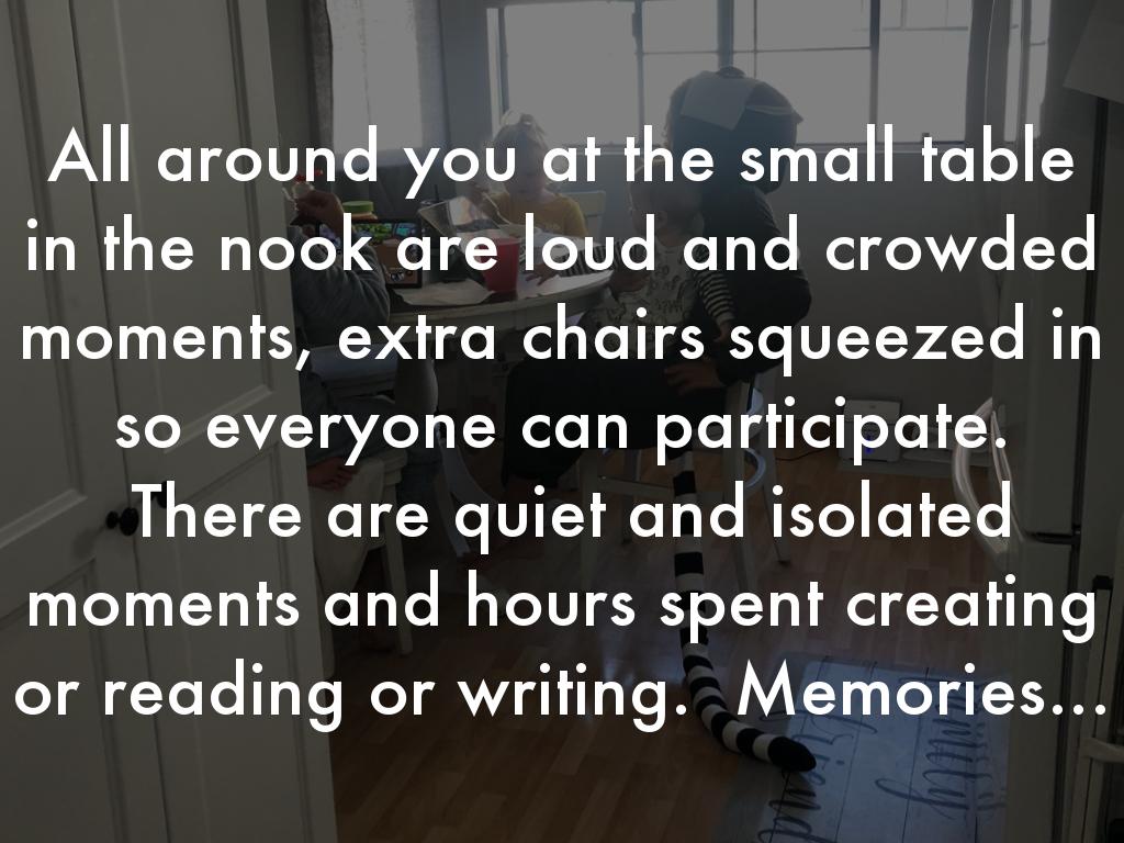All around you at the small table in the nook are loud and crowded moments, extra chairs squeezed in so everyone can participate. There are quiet and isolated moments and hours spent creating or reading or writing. Memories…