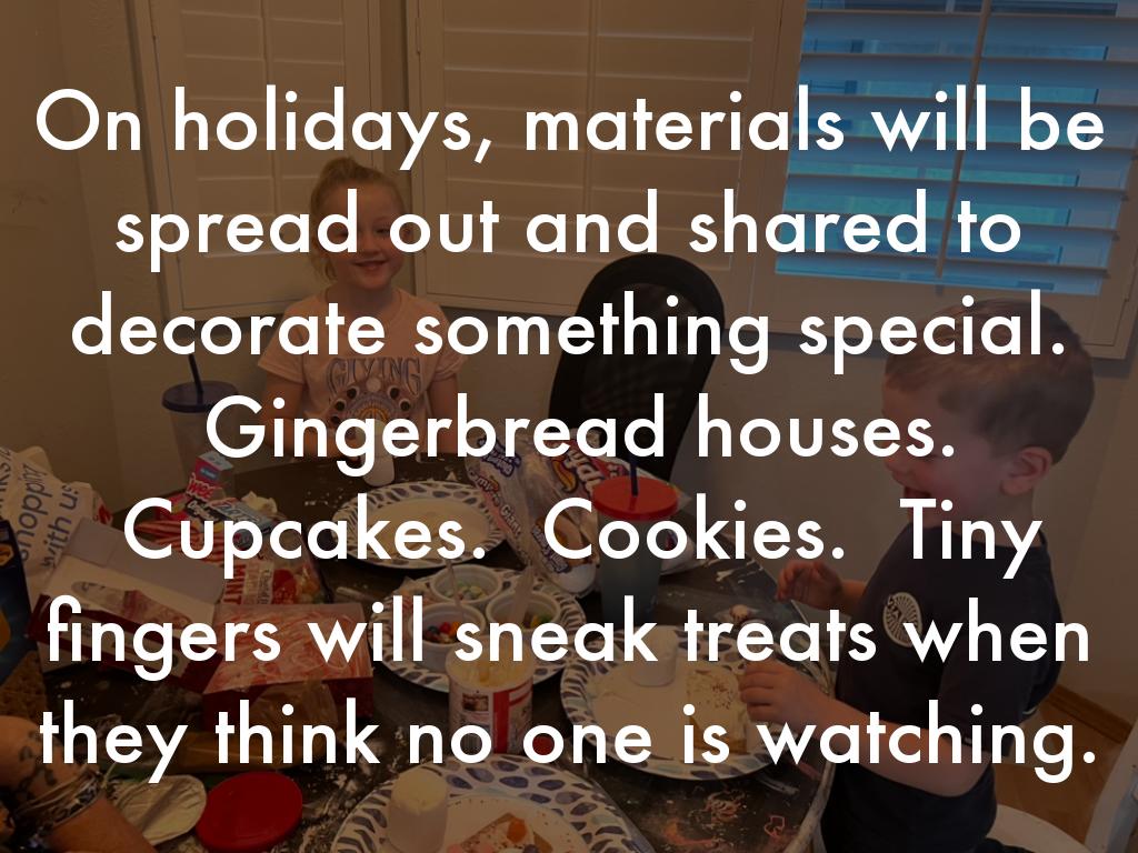 On holidays, materials will be spread out and shared to decorate something special. Gingerbread houses. Cupcakes. Cookies. Tiny fingers will sneak treats when they think no one is watching.