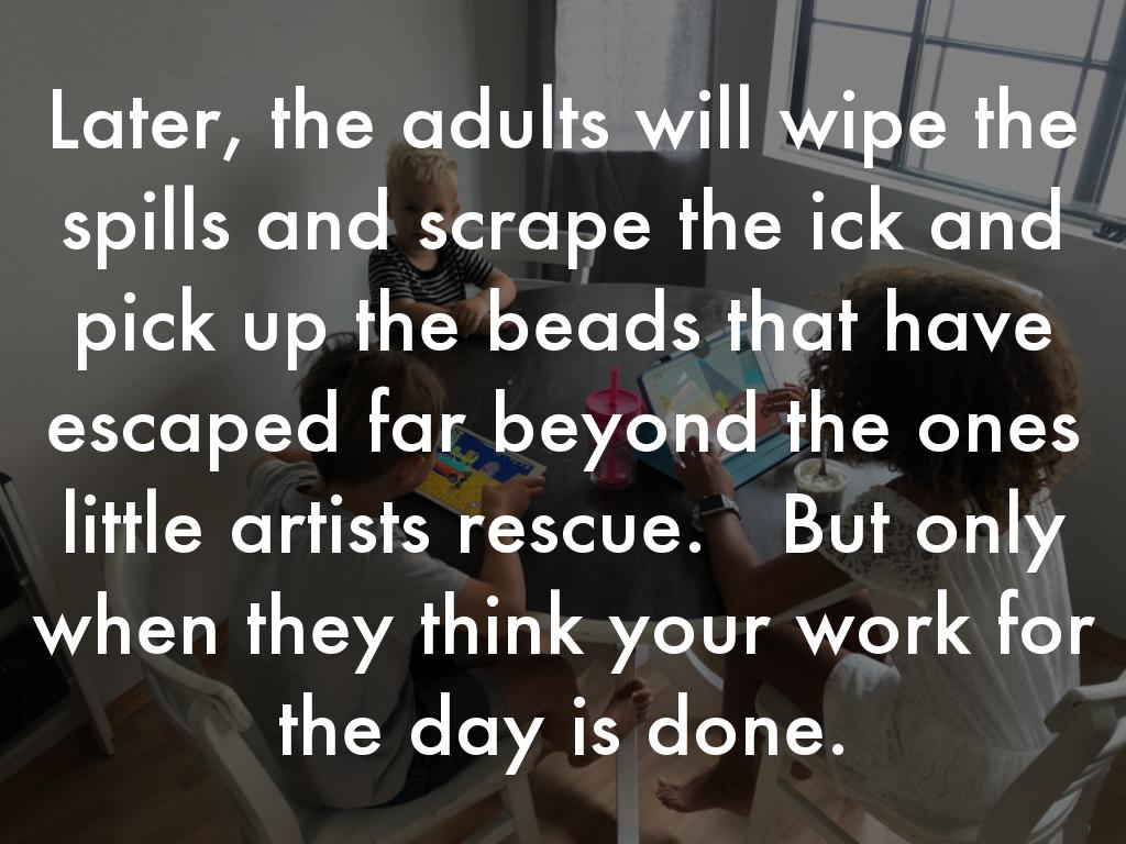 Later, the adults will wipe the spills and scrape the ick and pick up the beads that have escaped far beyond the ones little artists rescue. But only when they think your work for the day is done.