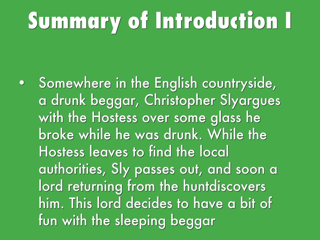 Somewhere in the English countryside, a drunk beggar, Christopher Slyargues with the Hostess over some glass he broke while he was drunk. While the Hostess leaves to find the local authorities, Sly passes out, and soon a lord returning from the huntdiscovers him. This lord decides to have a bit of fun with the sleeping beggar