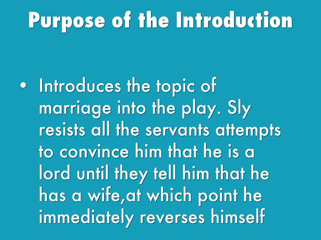 Introduces the topic of marriage into the play. Sly resists all the servants attempts to convince him that he is a lord until they tell him that he has a wife,at which point he immediately reverses himself