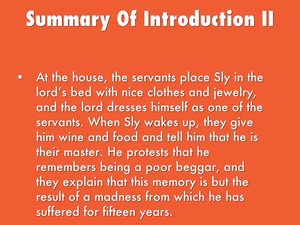 At the house, the servants place Sly in the lord’s bed with nice clothes and jewelry, and the lord dresses himself as one of the servants. When Sly wakes up, they give him wine and food and tell him that he is their master. He protests that he remembers being a poor beggar, and they explain that this memory is but the result of a madness from which he has suffered for fifteen years.