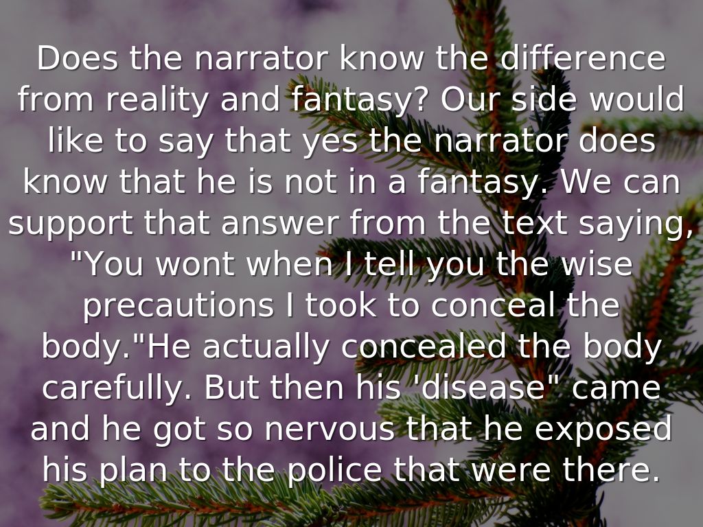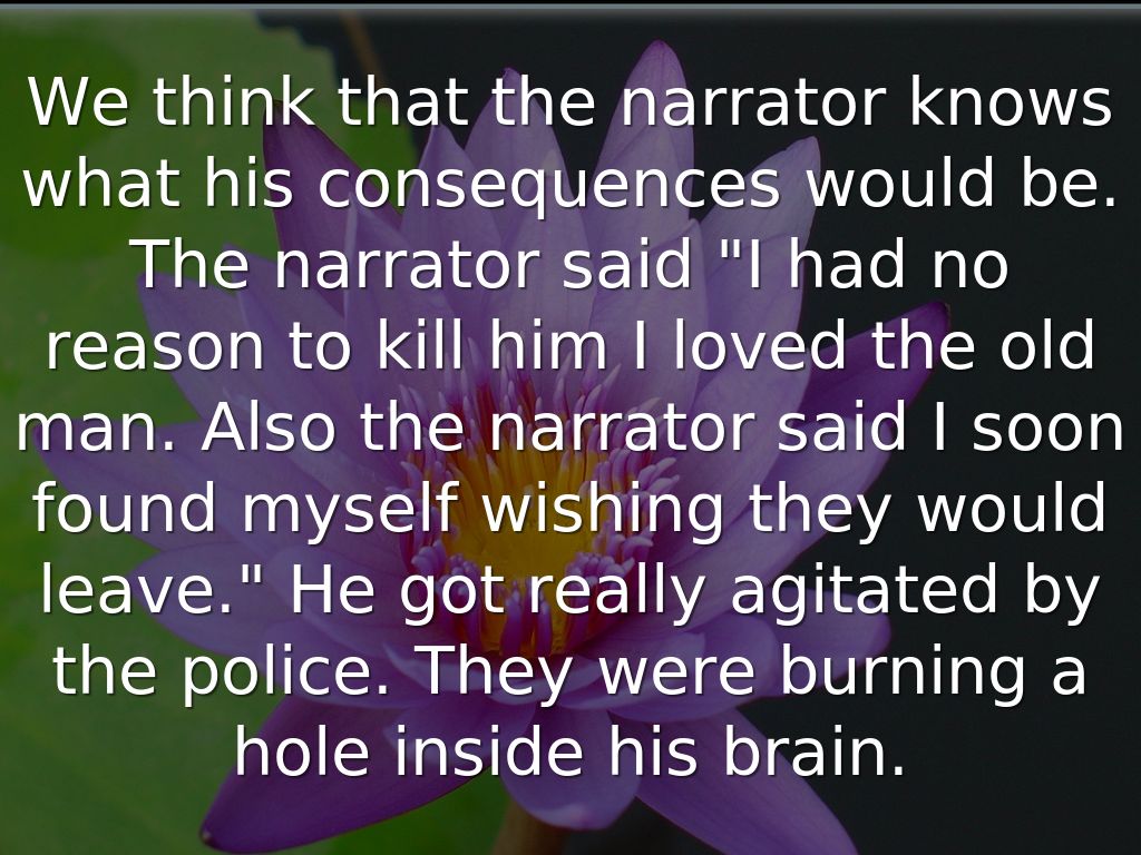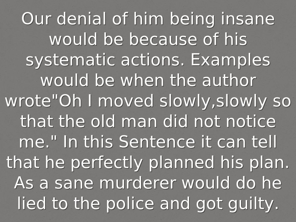 Our denial of him being insane would be because of his systematic actions. Examples would be when the author wrote"Oh I moved slowly,slowly so that the old man did not notice me." In this Sentence it can tell that he perfectly planned his plan. As a sane murderer would do he lied to the police and got guilty.