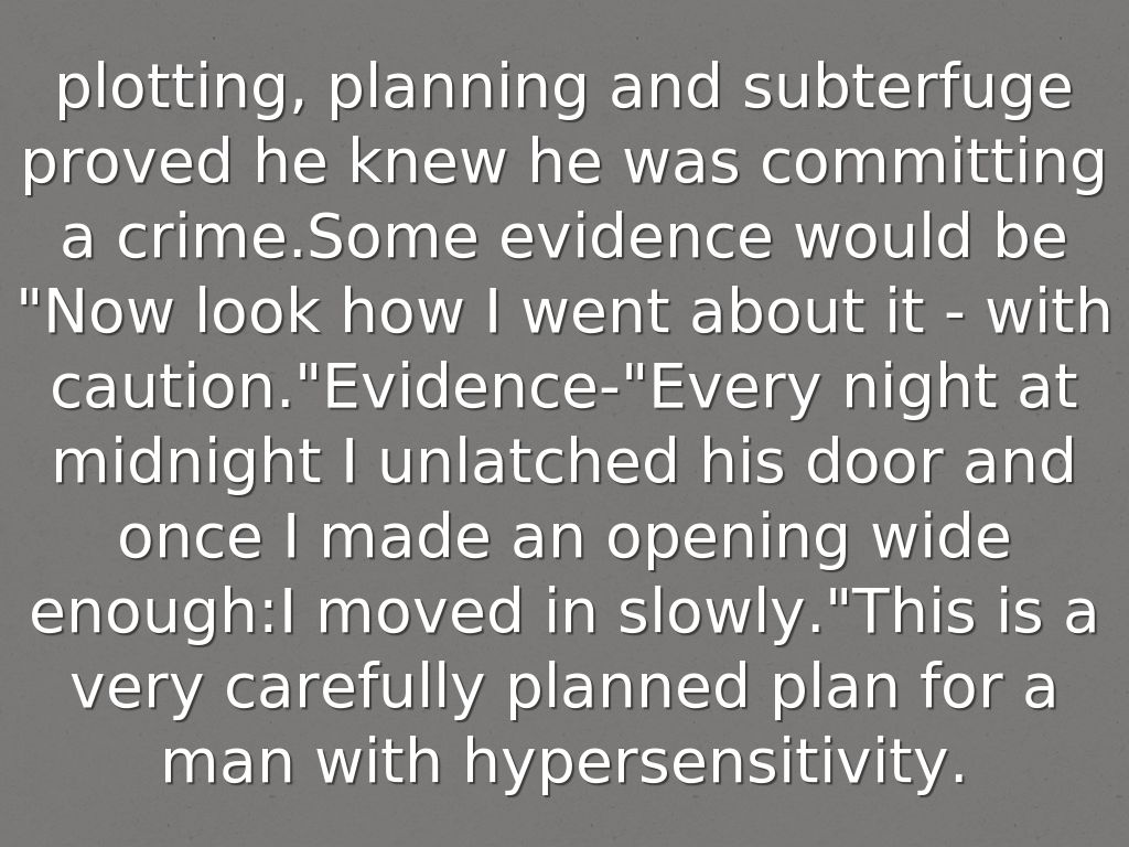 plotting, planning and subterfuge proved he knew he was committing a crime.Some evidence would be "Now look how I went about it - with caution."Evidence-"Every night at midnight I unlatched his door and once I made an opening wide enough:I moved in slowly."This is a very carefully planned plan for a man with hypersensitivity.