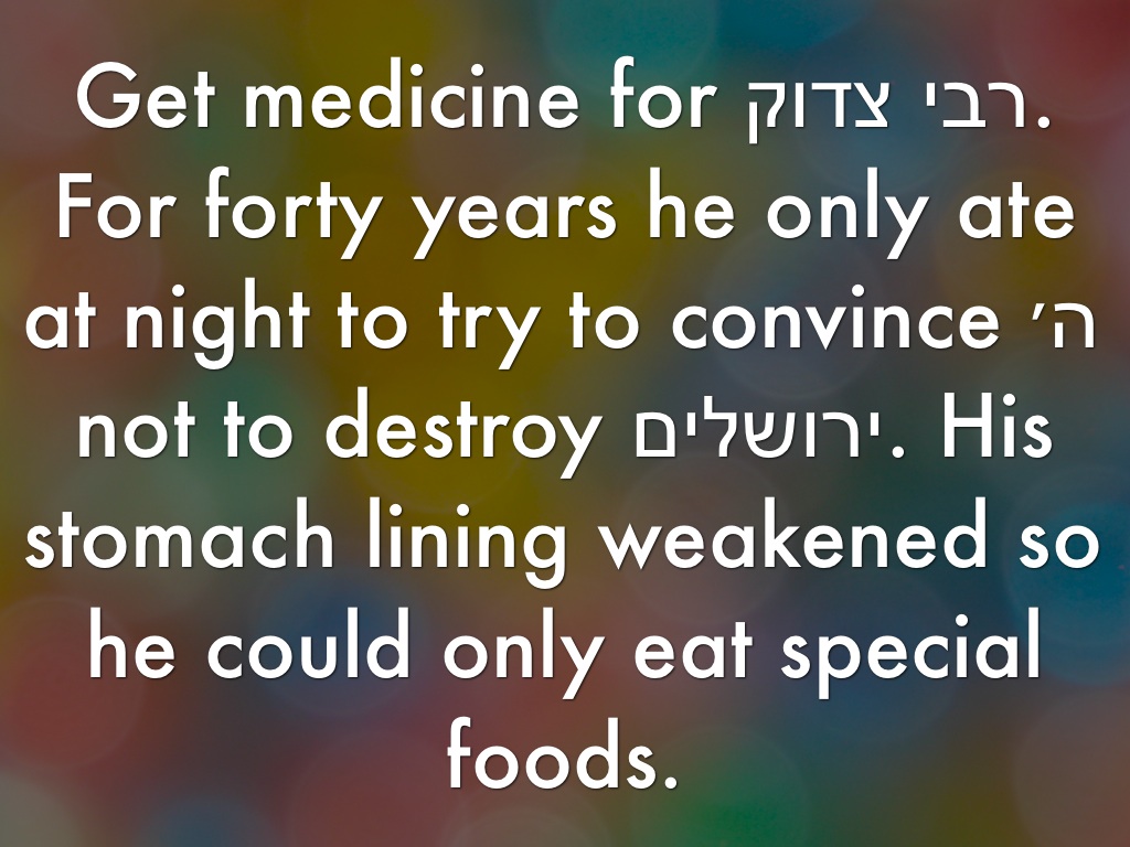 Get medicine for רבי צדוק. For forty years he only ate at night to try to convince ה׳ not to destroy ירושלים. His stomach lining weakened so he could only eat special foods.
