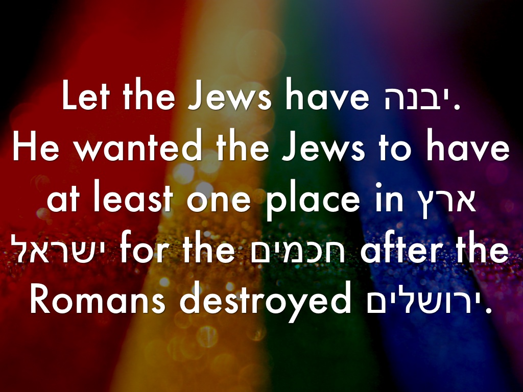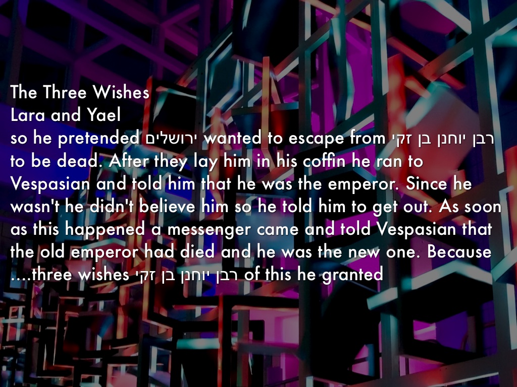 The Three Wishes Lara and Yael רבן יוחנן בן זקי wanted to escape from ירושלים so he pretended to be dead. After they lay him in his coffin he ran to Vespasian and told him that he was the emperor. Since he wasn't he didn't believe him so he told him to get out. As soon as this happened a messenger came and told Vespasian that the old emperor had died and he was the new one. Because of this he granted רבן יוחנן בן זקי three wishes.