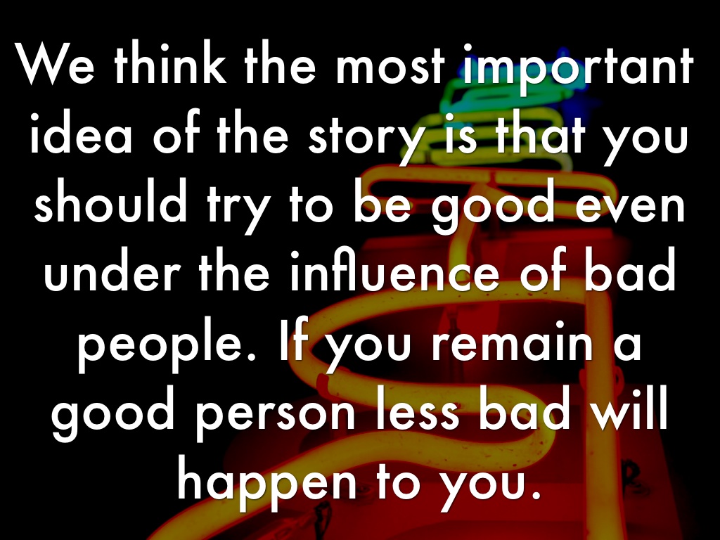 We think the most important idea of the story is that you should try to be good even under the influence of bad people. If you remain a good person less bad will happen to you.