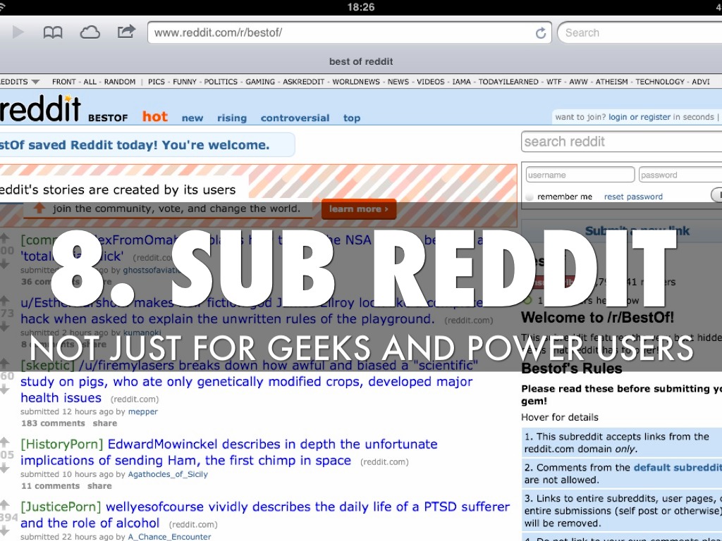 Sub reddits are awesome for great content and understanding what works in large and niche communities. Warning: Reddit could ruin your creativity if you're easily lost online
