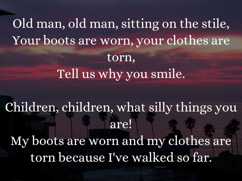 The poem is about an old traveller who walks and walks and sits on a stile, and children asking how he is able to do things when he is so old.