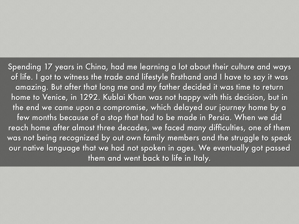 Spending 17 years in China, had me learning a lot about their culture and ways of life. I got to witness the trade and lifestyle firsthand and I have to say it was amazing. But after that long me and my father decided it was time to return home to Venice, in 1292. Kublai Khan was not happy with this decision, but in the end we came upon a compromise, which delayed our journey home by a few months because of a stop that had to be made in Persia. When we did reach home after almost three decades, we faced many difficulties, one of them was not being recognized by out own family members and the struggle to speak our native language that we had not spoken in ages. We eventually got passed them and went back to life in Italy.