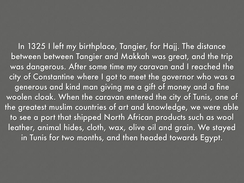 In 1325 I left my birthplace, Tangier, for Hajj. The distance between between Tangier and Makkah was great, and the trip was dangerous. After some time my caravan and I reached the city of Constantine where I got to meet the governor who was a generous and kind man giving me a gift of money and a fine woolen cloak. When the caravan entered the city of Tunis, one of the greatest muslim countries of art and knowledge, we were able to see a port that shipped North African products such as wool leather, animal hides, cloth, wax, olive oil and grain. We stayed in Tunis for two months, and then headed towards Egypt.