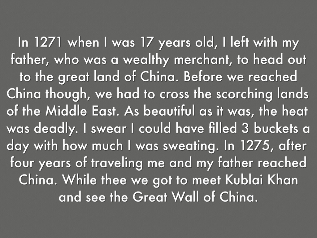 In 1271 when I was 17 years old, I left with my father, who was a wealthy merchant, to head out to the great land of China. Before we reached China though, we had to cross the scorching lands of the Middle East. As beautiful as it was, the heat was deadly. I swear I could have filled 3 buckets a day with how much I was sweating. In 1275, after four years of traveling me and my father reached China. While thee we got to meet Kublai Khan and see the Great Wall of China.