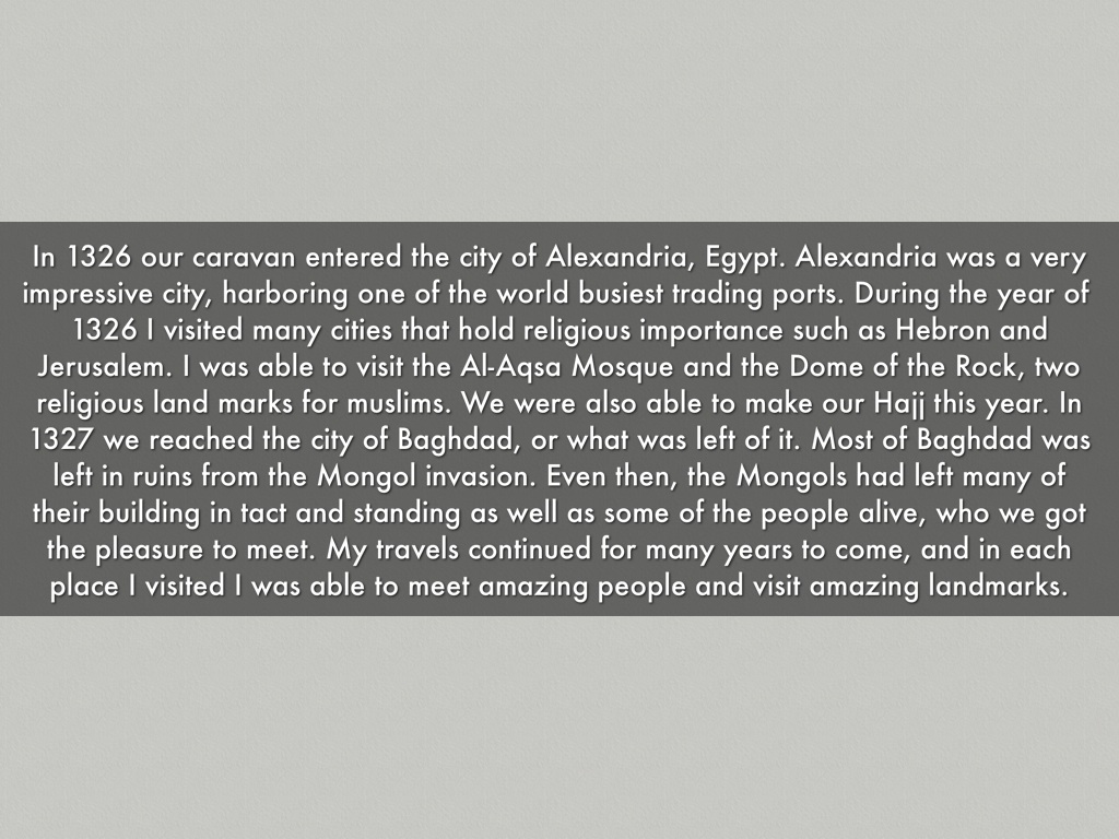 In 1326 our caravan entered the city of Alexandria, Egypt. Alexandria was a very impressive city, harboring one of the world busiest trading ports. During the year of 1326 I visited many cities that hold religious importance such as Hebron and Jerusalem. I was able to visit the Al-Aqsa Mosque and the Dome of the Rock, two religious land marks for muslims. We were also able to make our Hajj this year. In 1327 we reached the city of Baghdad, or what was left of it. Most of Baghdad was left in ruins from the Mongol invasion. Even then, the Mongols had left many of their building in tact and standing as well as some of the people alive, who we got the pleasure to meet. My travels continued for many years to come, and in each place I visited I was able to meet amazing people and visit amazing landmarks.