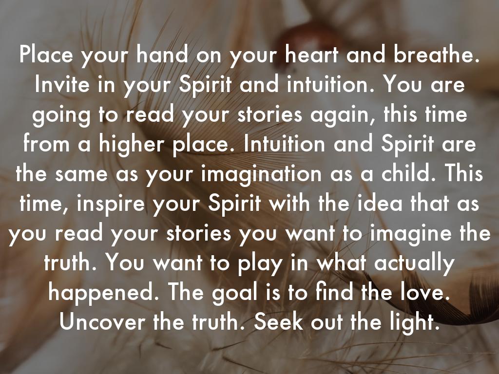 Place your hand on your heart and breathe. Invite in your Spirit and intuition. You are going to read your stories again, this time from a higher place. Intuition and Spirit are the same as your imagination as a child. This time, inspire your Spirit with the idea that as you read your stories you want to imagine the truth. You want to play in what actually happened. The goal is to find the love. Uncover the truth. Seek out the light.